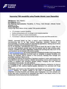 In this study, we’ll explore how Ti64 powder was treated using the Forge Nano Atomic Armor™ platform, an ultrathin coating on the order of nanometers. Key powder properties, including flowability and density were investigated, and cube samples and tensile bars were manufactured to understand the effect of the Atomic Armor on the material and mechanical properties of printed parts.